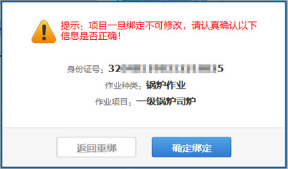 5、弹出信息确认框,请核对身份证号、培训项目名称,如果有误,点击“返回重绑”按钮修改,如果正确,点击“确定绑定”按钮完成绑定。